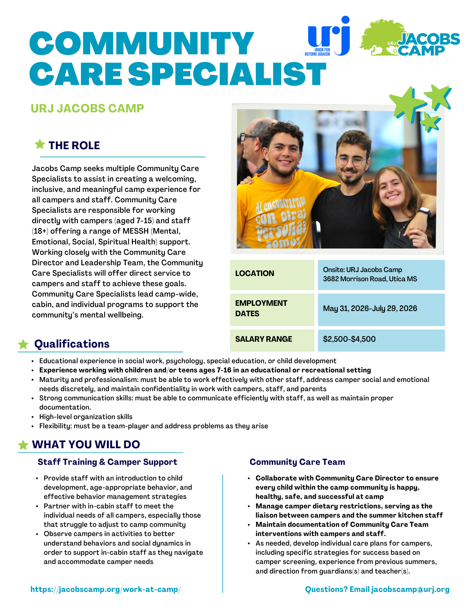 Jacobs Camp is looking for compassionate, hands-on individuals to join our Camper Care Team! As a Community Care Specialist, you’ll support campers and staff, model positive behavior strategies, and help create a safe and inclusive camp environment. Perfect for students or professionals in education, social work, or psychology who want meaningful, real-world experience this summer. Jacobs Camp is able to support students in field education, as we have licensed supervisors who can provide appropriate oversight and documentation.