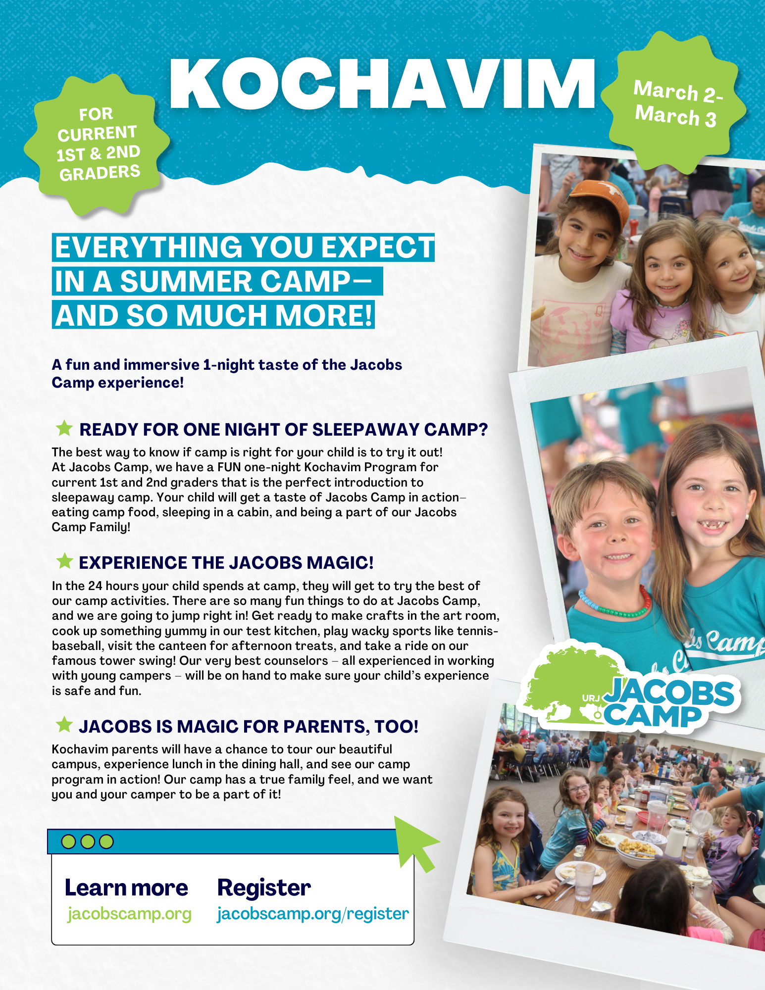 This one-week program offers first-time campers who are currently in 1st or 2nd grade the opportunity to get a taste of what Jacobs Camp is all about!
