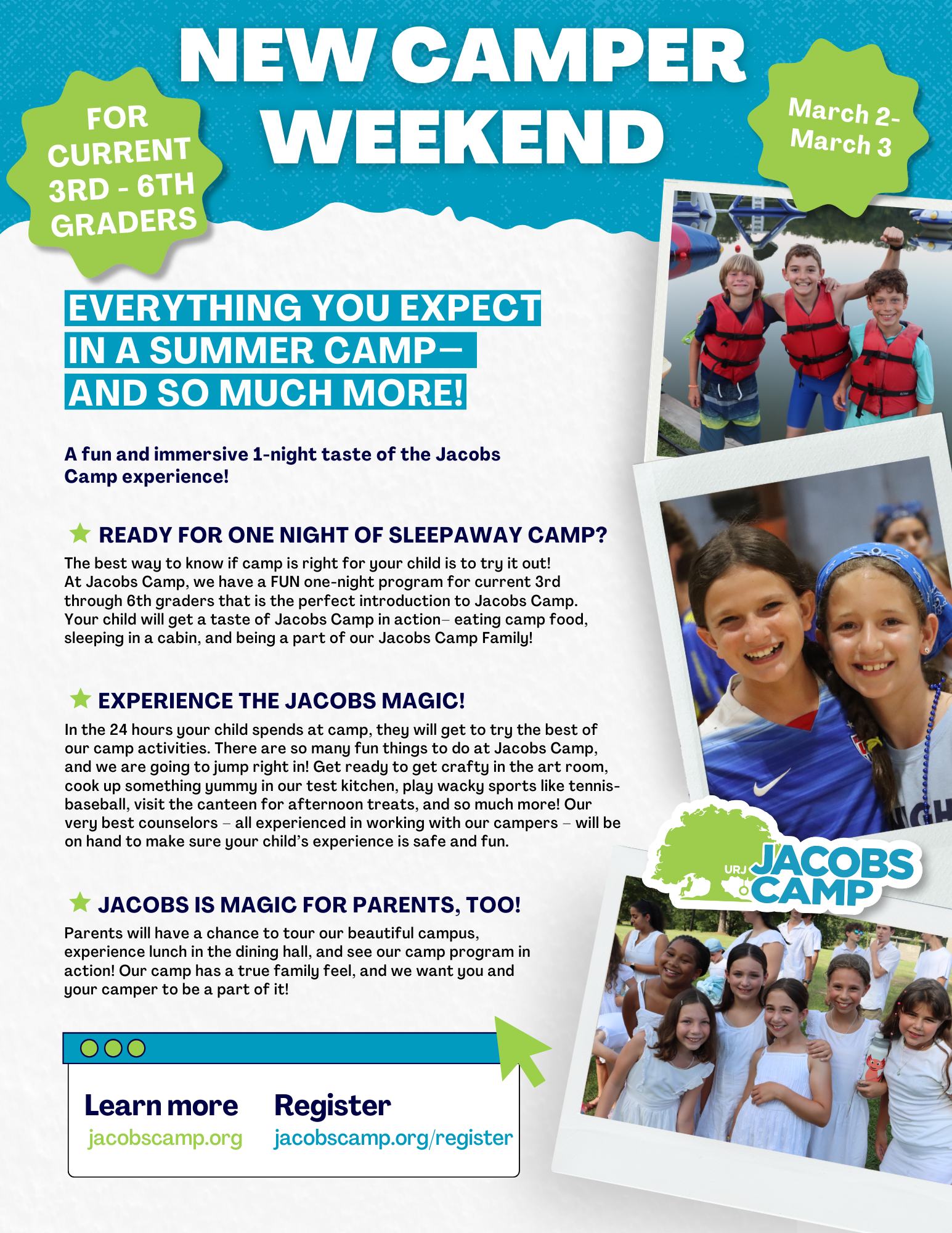 At New Camper Weekend, your child can get a taste of Jacobs life while camp is in action. New Camper Weekend will give your child the opportunity to have a great summer experience in the springtime: participating in creative programming and great specialty activities, and spending a day living the life of a camper – eating camp food, sleeping in a cabin, and spending time with our terrific counselors and staff members.